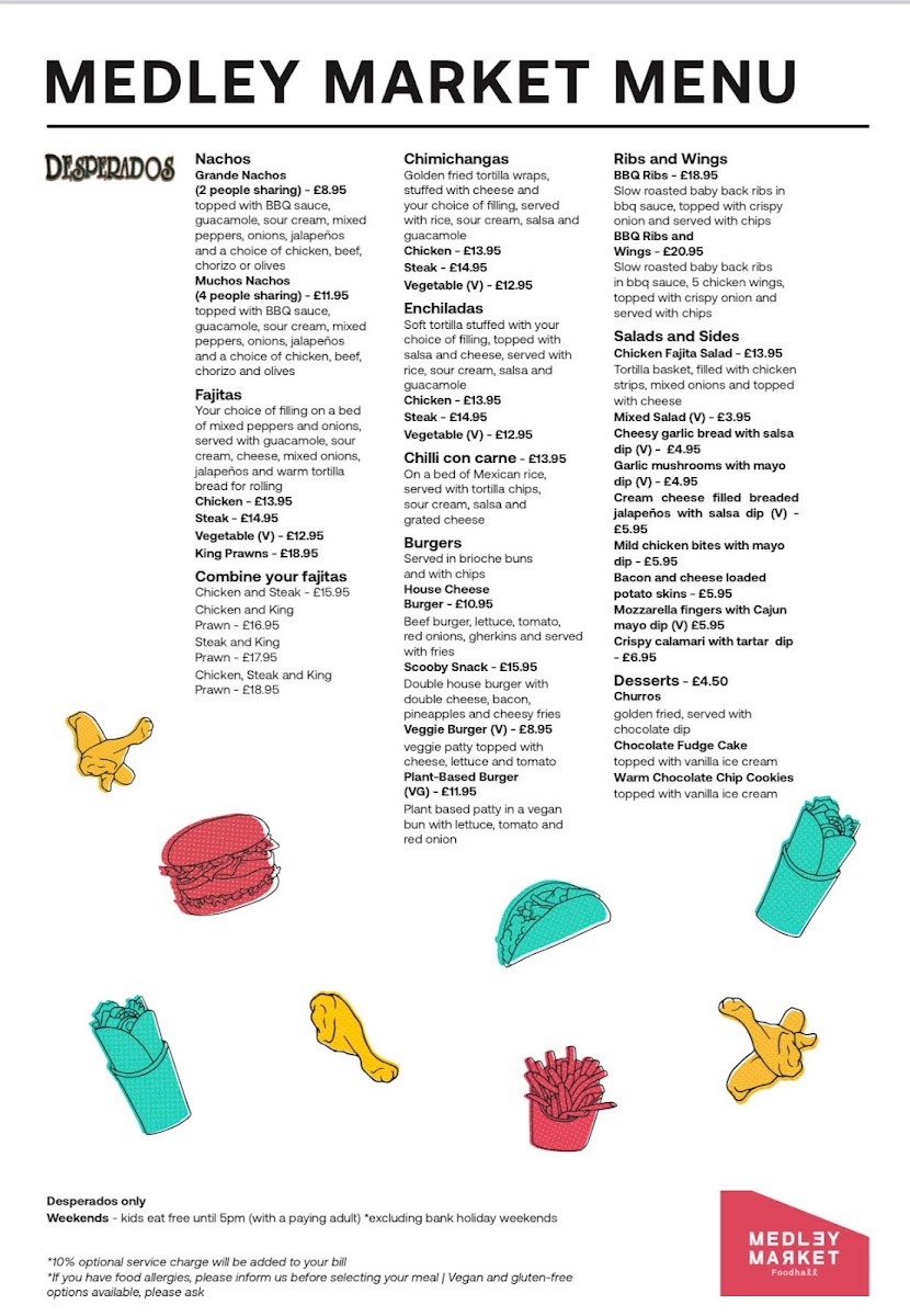 The menu at Medley Bar & Kitchen offers a vibrant mix of comfort food with a hint of international flair. For burger enthusiasts, there are options like The Ultimate BBQ Brisket, The Smoky Pulled Pork, and the classic Cheeseburger. Each burger is paired with sides such as crispy Fries, creamy Mac and Cheese, or tangy K-Slaw. The restaurant also features a unique selection of chicken burgers under the Seoul Chikin category, including the fiery Buffalo Seoul Burger and the sweet and spicy Korean BBQ Burger. For something more adventurous, diners can try the Sriracha Gold Burger or the Chilli Bang Burger. Those in the mood for a lighter bite can opt for Papi Taco dishes like Burritos, Tacos, or a Rice Bowl. Soft drink choices include classic sodas like Coca Cola and Sprite, and dessert options are simple yet satisfying with Churros with Chocolate Dip. The restaurant also offers a variety of meal deals, such as the Meal Deal For 1 or the Flying Seoul Deal, which pair well with sides like Curly Fries, Onion Rings, or Sweet Potato Fries. For those seeking bold flavors, the Desperados selection includes sizzling Fajitas, Chimichangas, and Enchiladas. You can also enjoy the Wham Bam Wings for a tasty snack or opt for the loaded Quesadilla for a hearty treat. Whether you’re craving something spicy, sweet, or savory, Medley Bar & Kitchen has a dish to satisfy every palate.